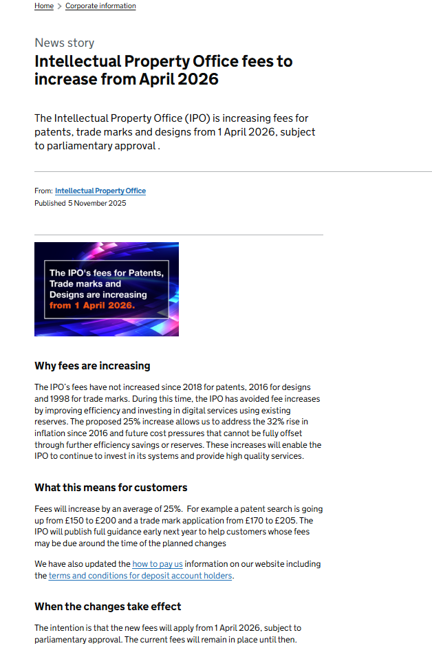 11月5日,英国知识产权局(IPO)发布最新通知:将从2026年4月1日起提高专利、商标和外观设计的费用,费用将平均增加25%。
